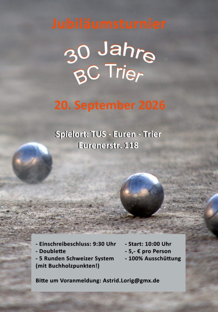 Anlässlich des 30jährigen Bestehens unseres Vereins möchten wir dieses Jahr noch einmal ein Turnier ausrichten. Bei Interesse meldet euch bitte bis zum 30. August 2026 an.